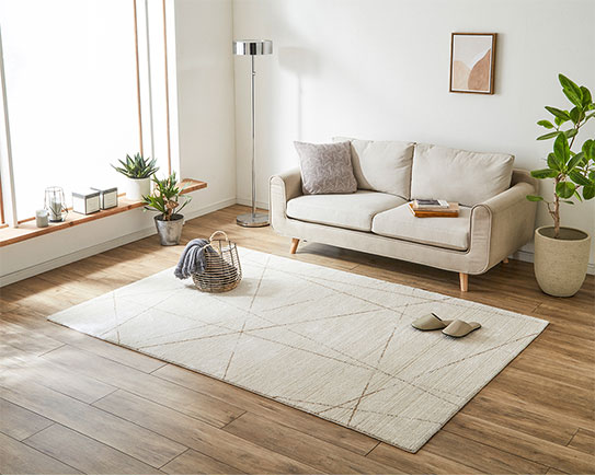 point3 ナチュラルカラーの床色も大きめのラグで隠して気にならない
